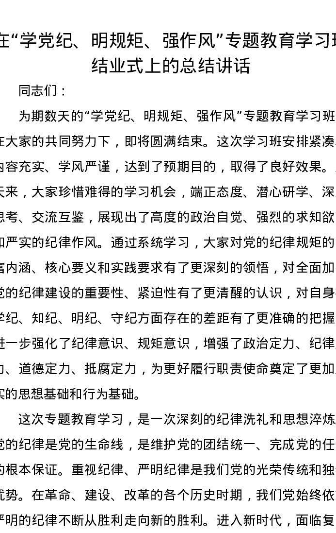 在“学党纪、明规矩、强作风”专题教育学习班结业式上的总结讲话