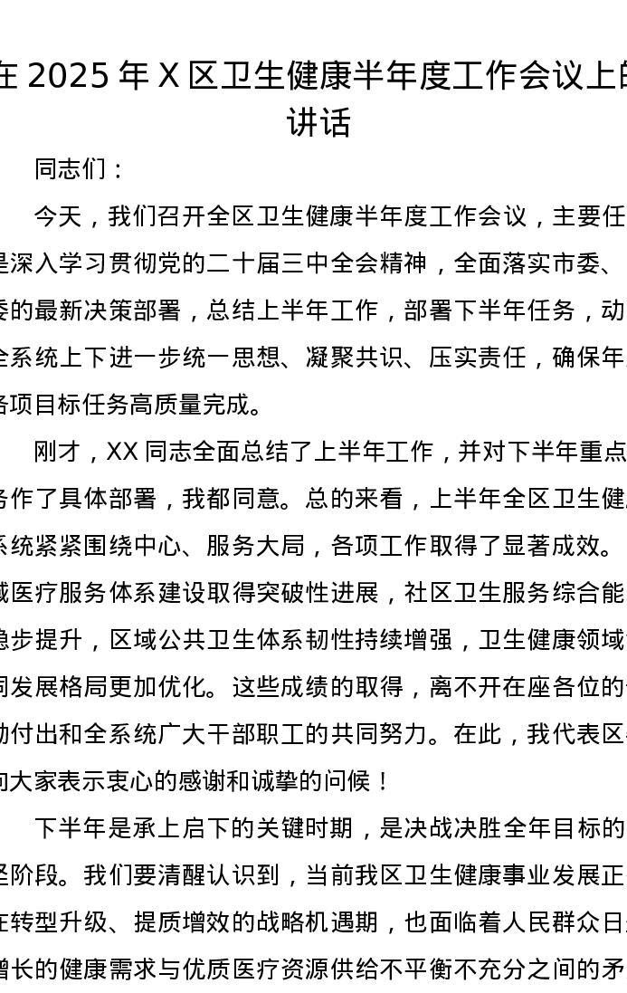 在2025年X区卫生健康半年度工作会议上的讲话
