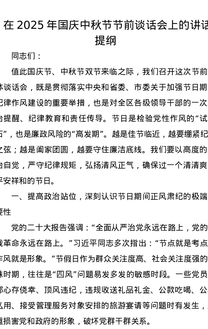 在2025年国庆中秋节节前谈话会上的讲话提纲