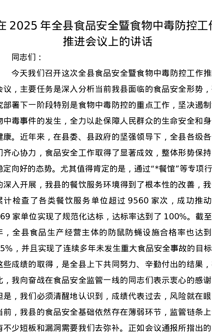 在2025年全县食品安全暨食物中毒防控工作推进会议上的讲话