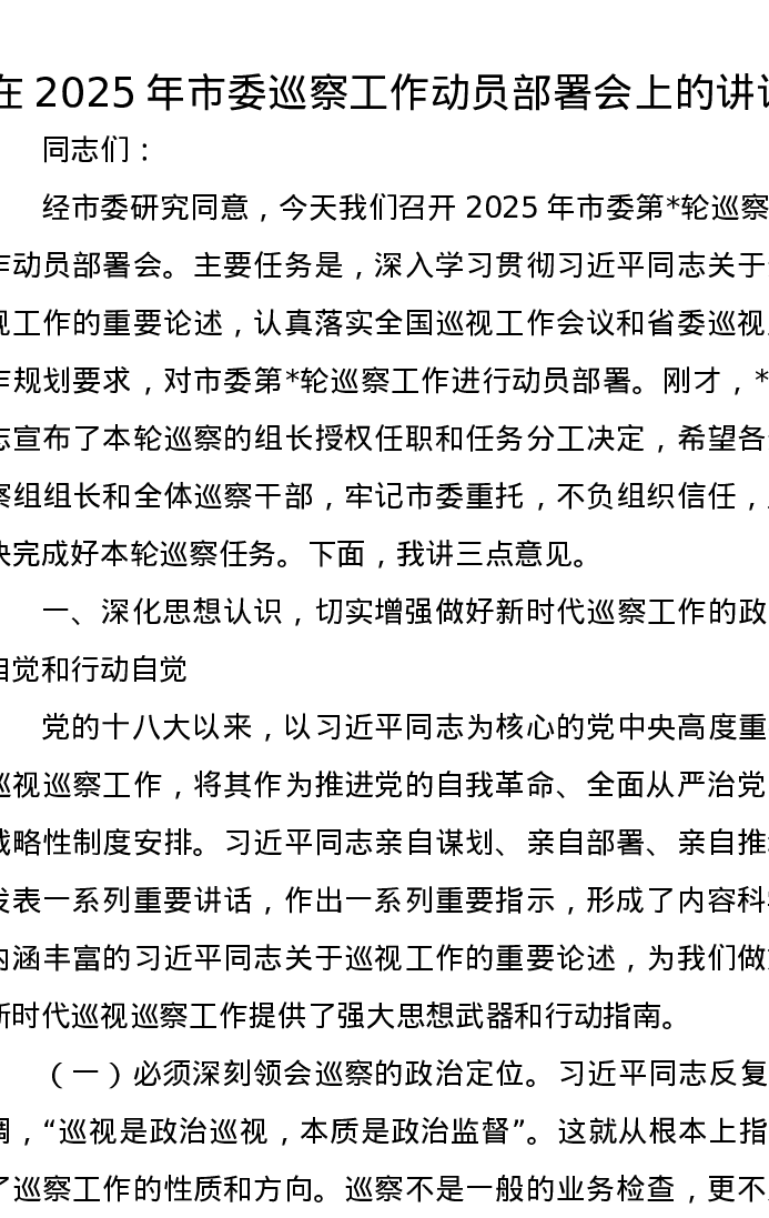 在2025年市委巡察工作动员部署会上的讲话