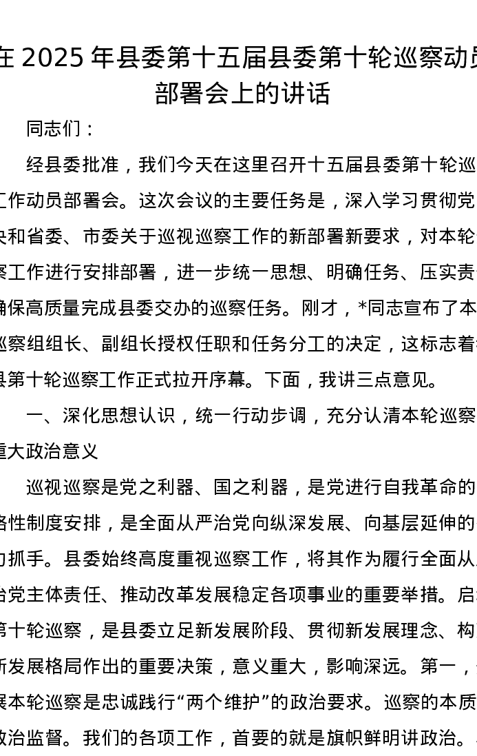 在2025年县委第十五届县委第十轮巡察动员部署会上的讲话