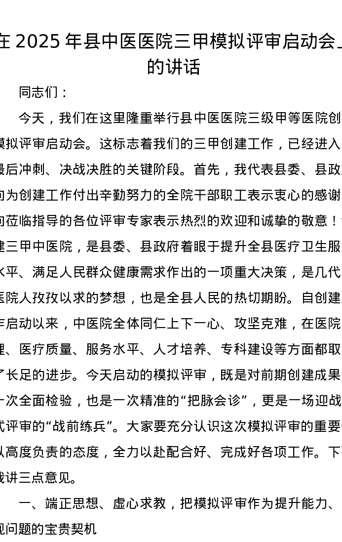 在2025年县中医医院三甲模拟评审启动会上的讲话