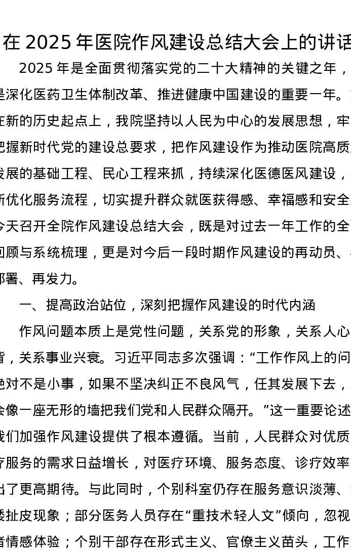 在2025年医院作风建设总结大会上的讲话