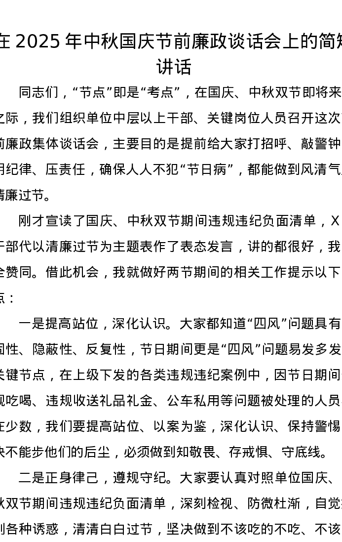 在2025年中秋国庆节前廉政谈话会上的简短讲话