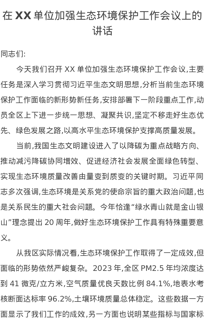 在XX单位加强生态环境保护工作会议上的讲话