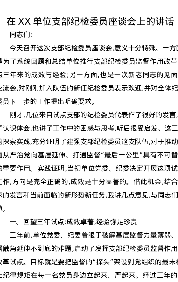 在XX单位支部纪检委员座谈会上的讲话