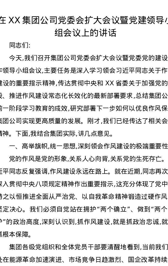 在XX集团公司党委会扩大会议暨党建领导小组会议上的讲话