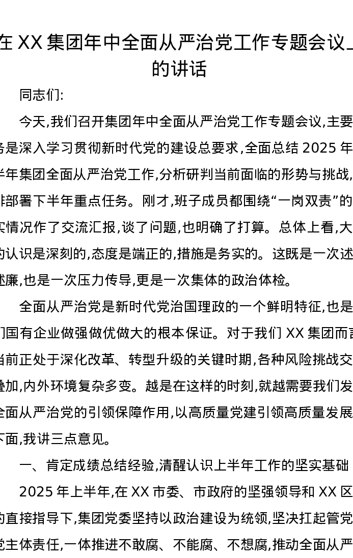 在XX集团年中全面从严治党工作专题会议上的讲话