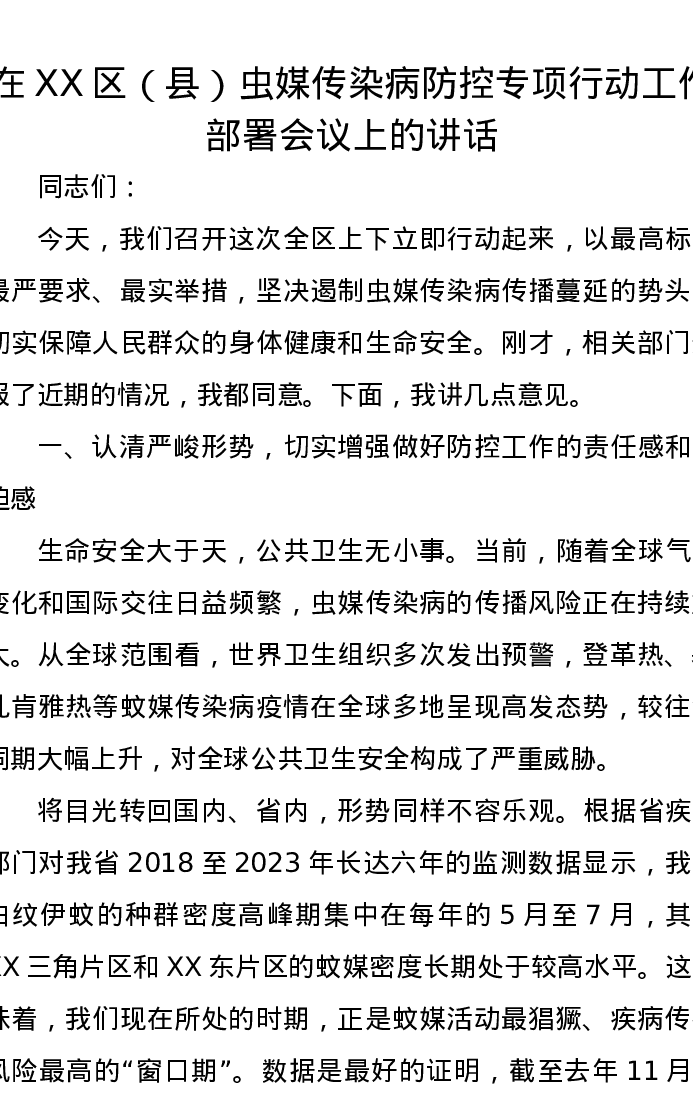 在XX区(县)虫媒传染病防控专项行动工作部署会议上的讲话