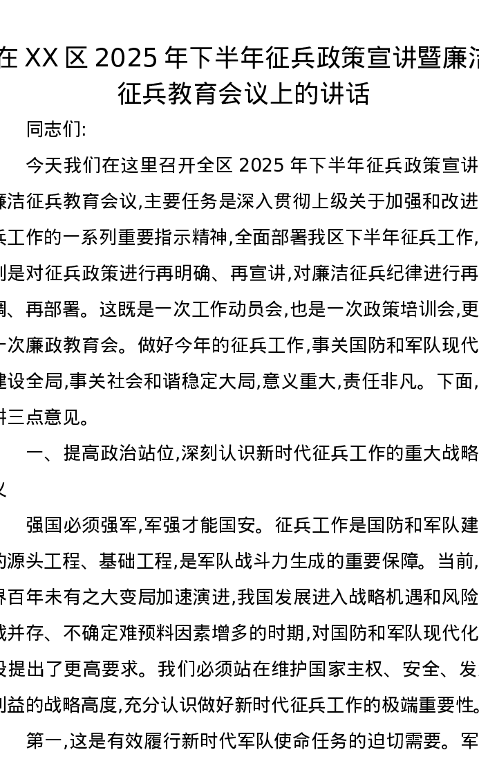 在XX区2025年下半年征兵政策宣讲暨廉洁征兵教育会议上的讲话