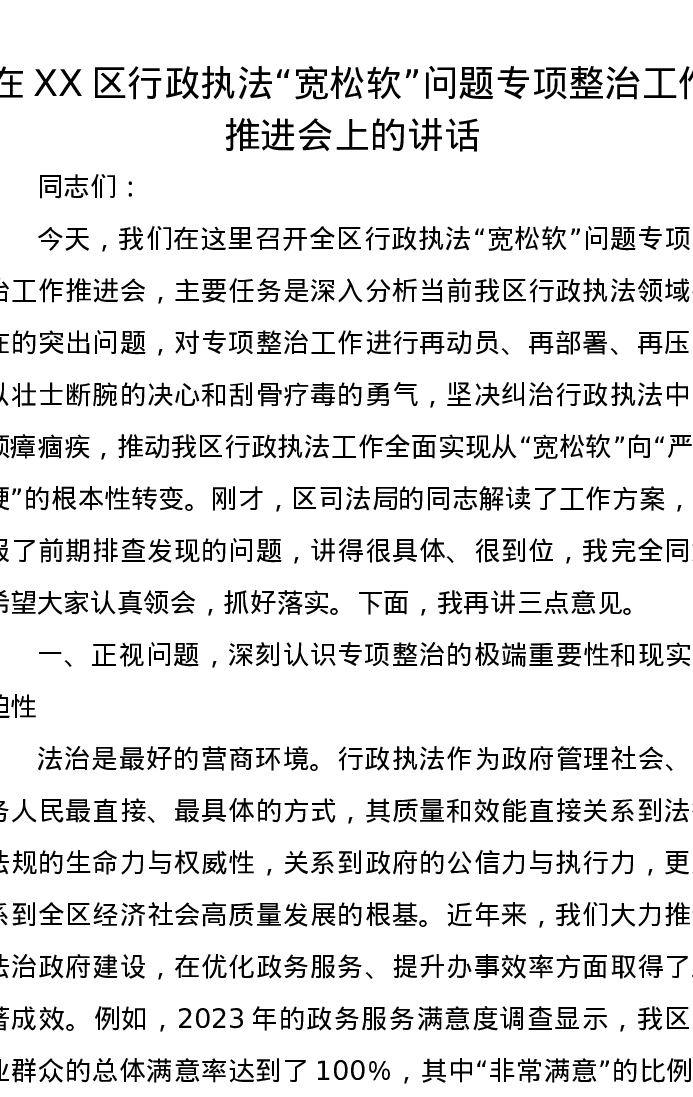 在XX区行政执法“宽松软”问题专项整治工作推进会上的讲话