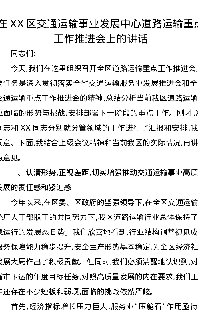 在XX区交通运输事业发展中心道路运输重点工作推进会上的讲话