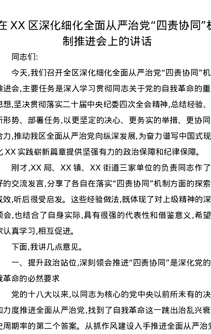 在XX区深化细化全面从严治党“四责协同”机制推进会上的讲话