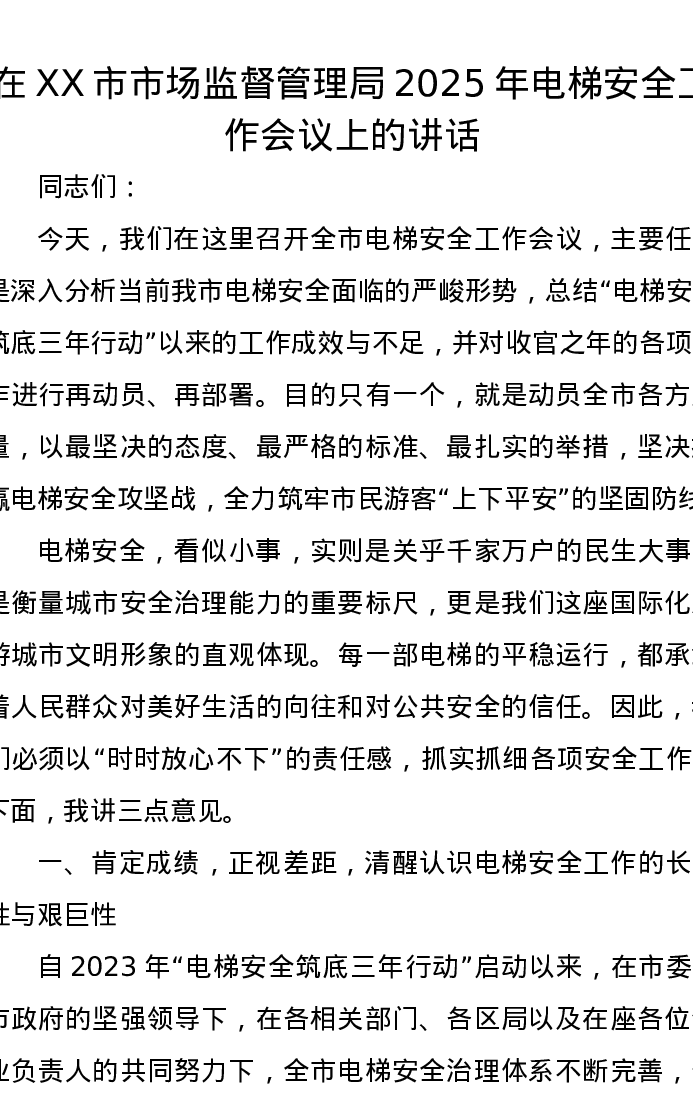 在XX市市场监督管理局2025年电梯安全工作会议上的讲话