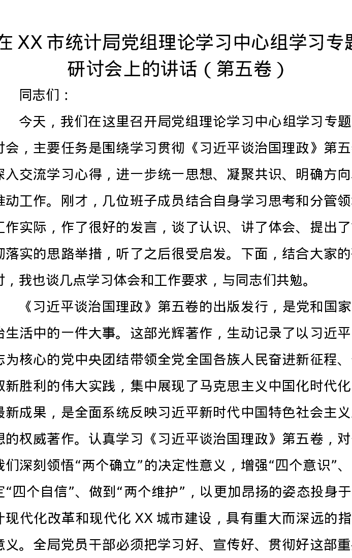 在XX市统计局党组理论学习中心组学习专题研讨会上的讲话(《治国理政》第五卷)