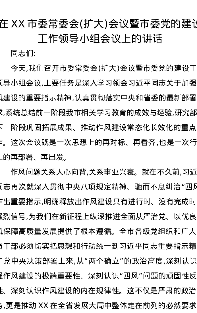 在XX市委常委会(扩大)会议暨市委党的建设工作领导小组会议上的讲话