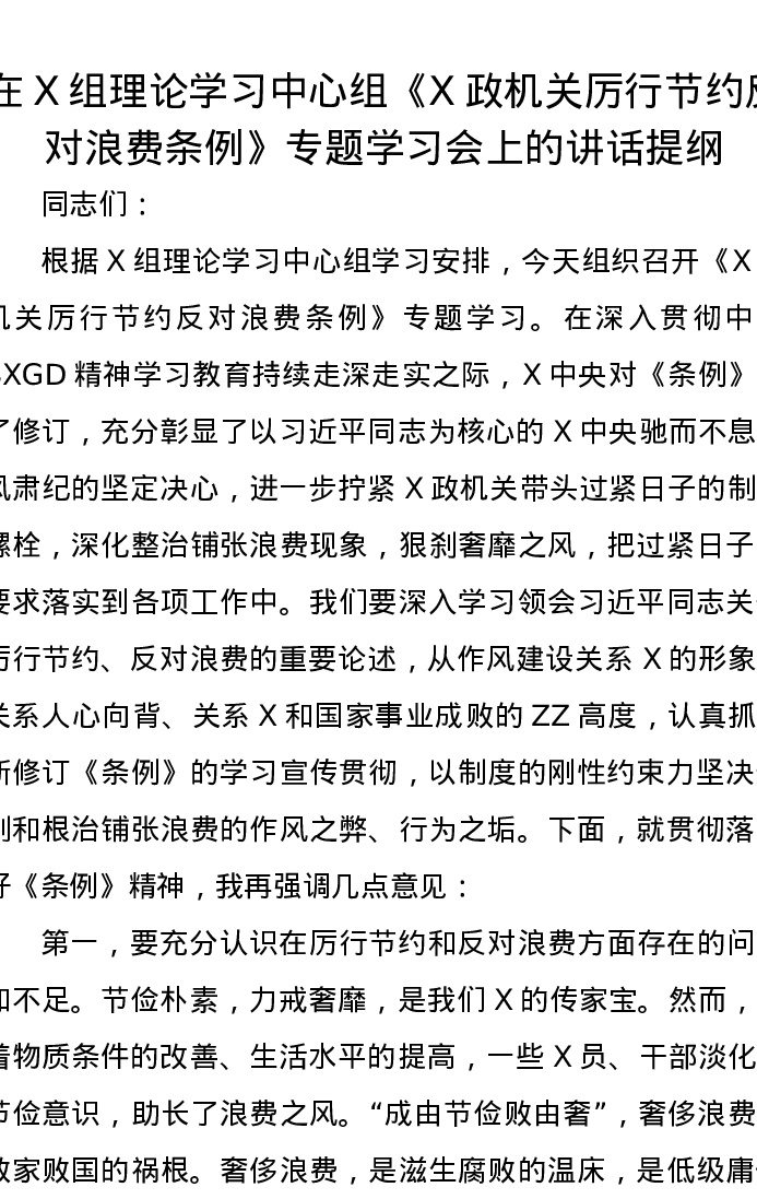 在党组理论学习中心组《党政机关厉行节约反对浪费条例》专题学习会上的讲话提纲