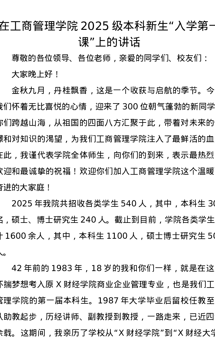 在工商管理学院2025级本科新生“入学第一课”上的讲话