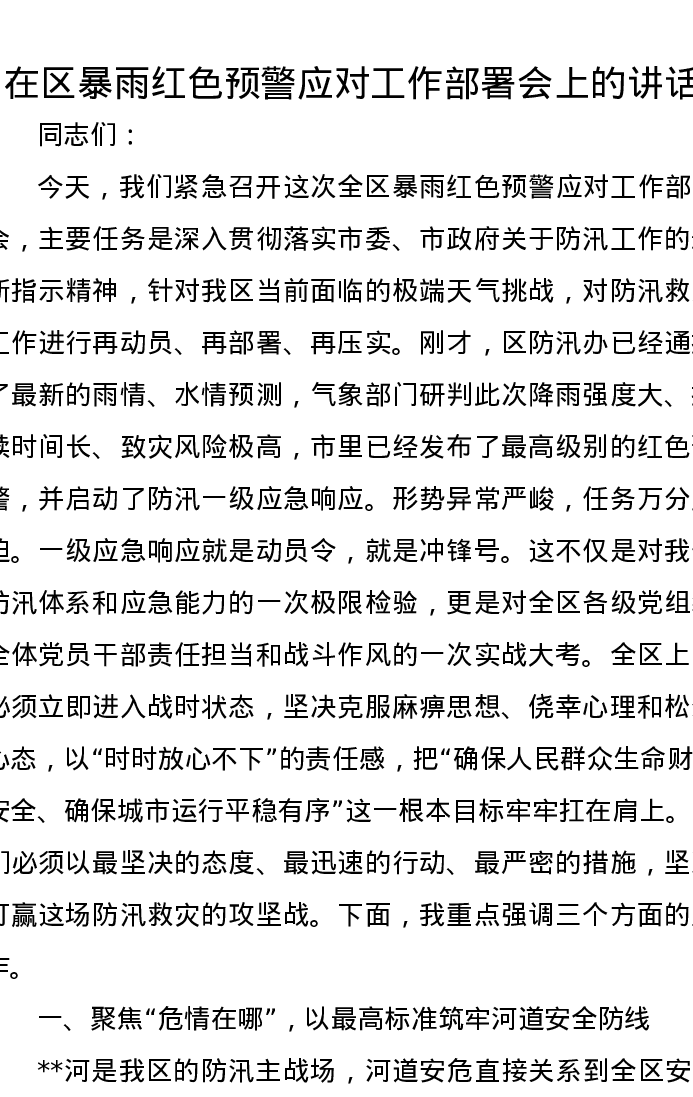 在区暴雨红色预警应对工作部署会上的讲话