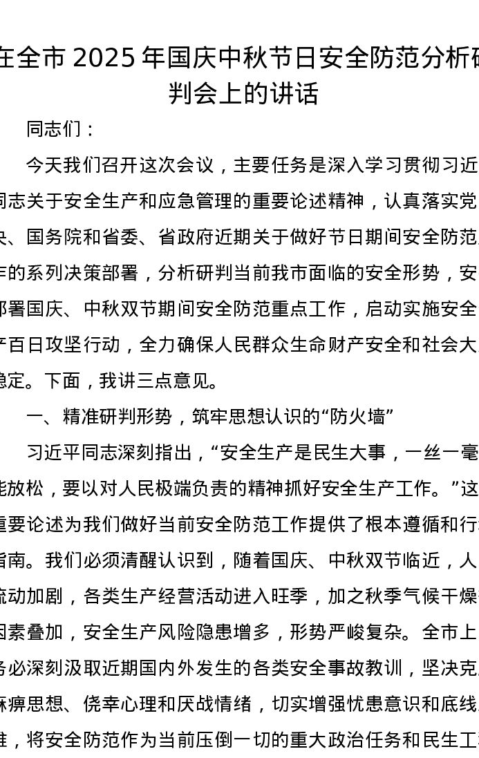在全市2025年国庆中秋节日安全防范分析研判会上的讲话