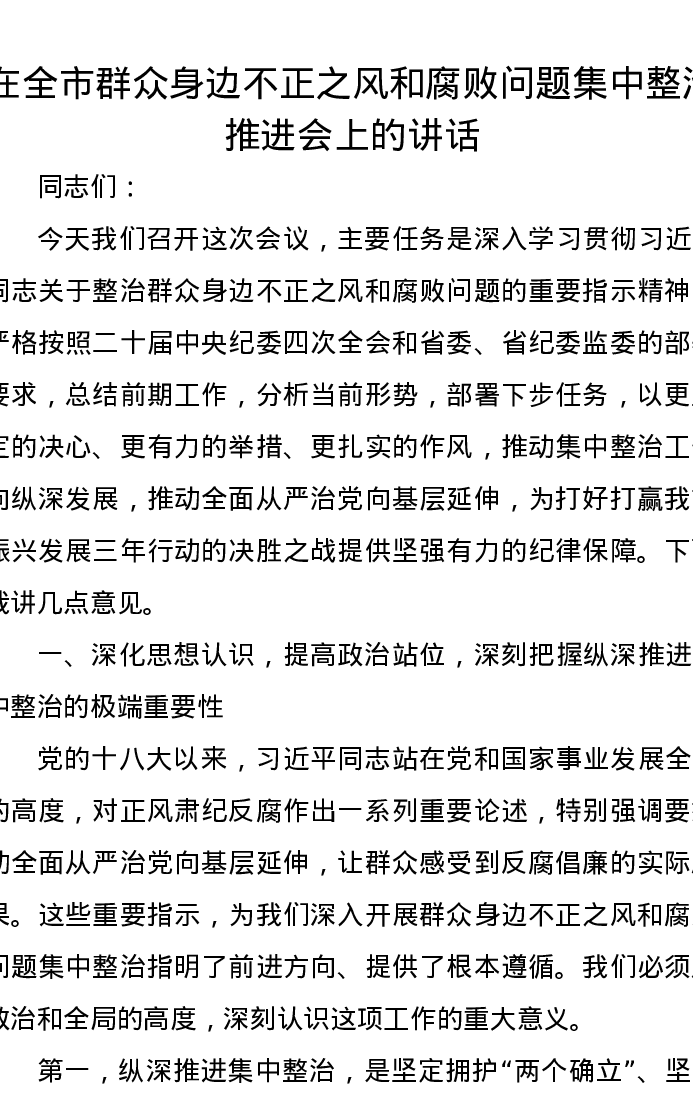 在全市群众身边不正之风和腐败问题集中整治推进会上的讲话