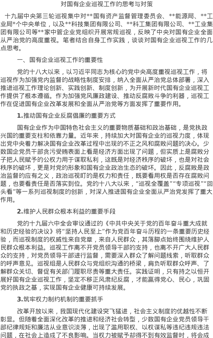 20220519对国有企业巡视工作的思考与对策