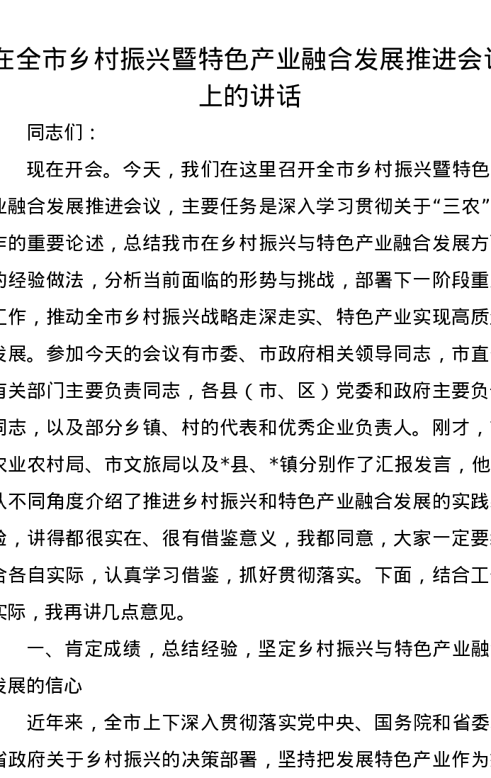 在全市乡村振兴暨特色产业融合发展推进会议上的讲话