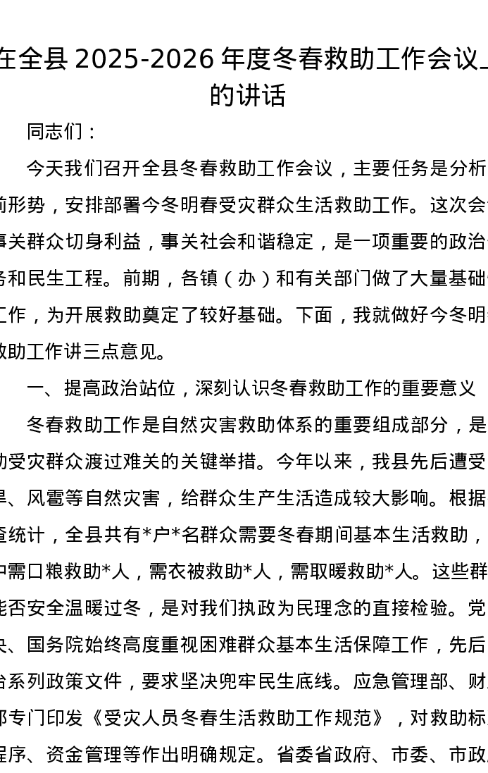 在全县2025-2026年度冬春救助工作会议上的讲话