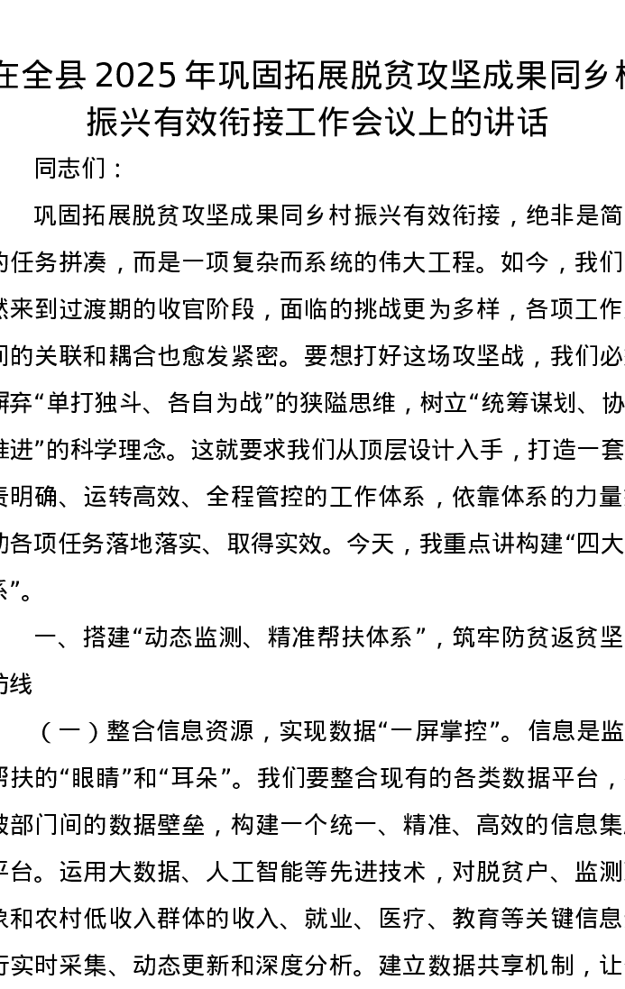 在全县2025年巩固拓展脱贫攻坚成果同乡村振兴有效衔接工作会议上的讲话