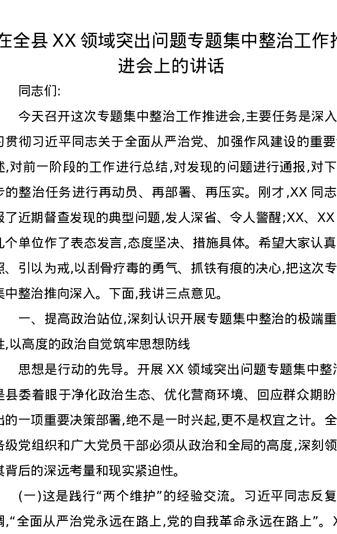 在全县XX领域突出问题专题集中整治工作推进会上的讲话