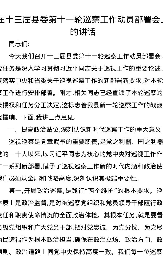 在十三届县委第十一轮巡察工作动员部署会上的讲话2