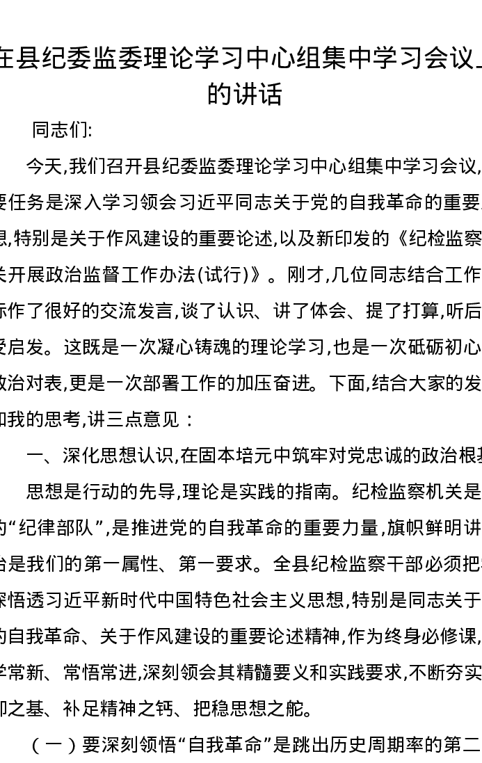 在县纪委监委理论学习中心组集中学习会议上的讲话《纪检监察机关开展政治监督工作办法(试行)》