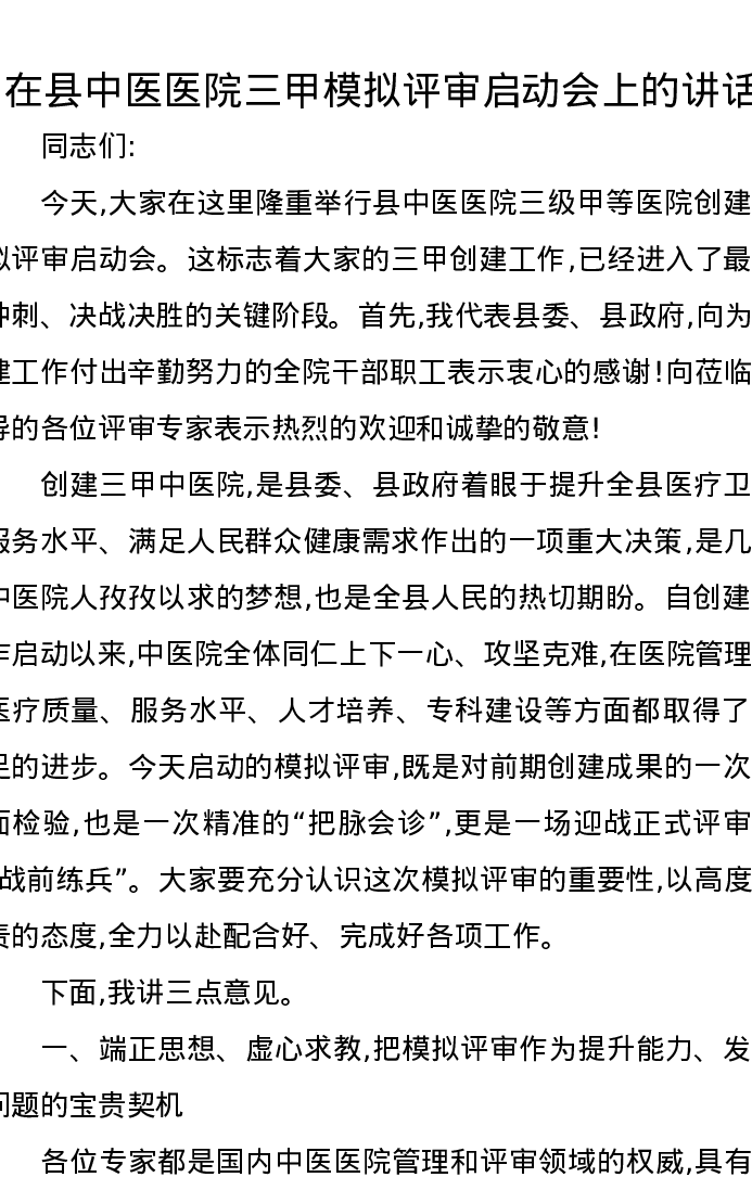 在县中医医院三甲模拟评审启动会上的讲话
