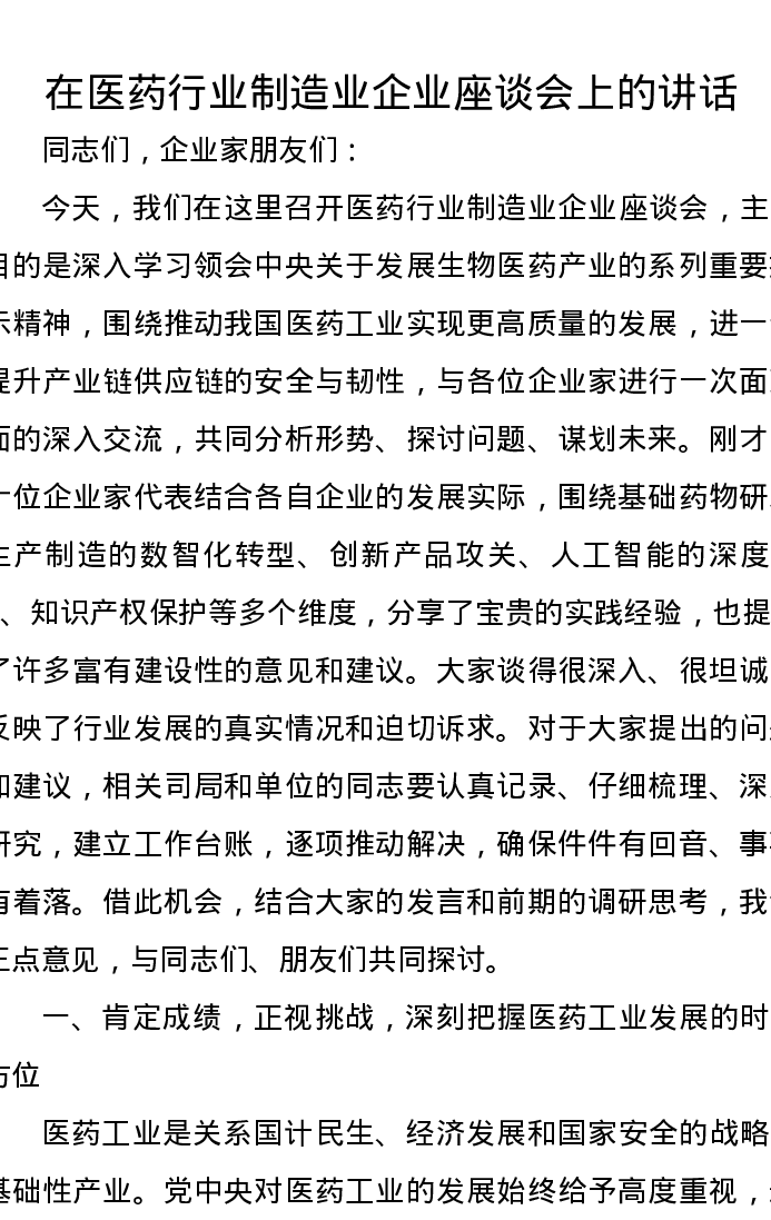 在医药行业制造业企业座谈会上的讲话
