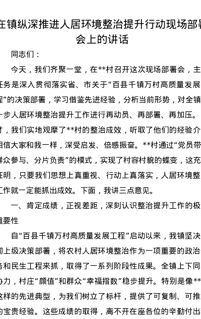 在镇纵深推进人居环境整治提升行动现场部署会上的讲话
