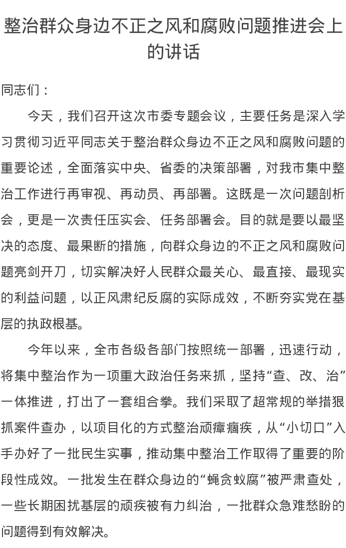 整治群众身边不正之风和腐败问题推进会上的讲话