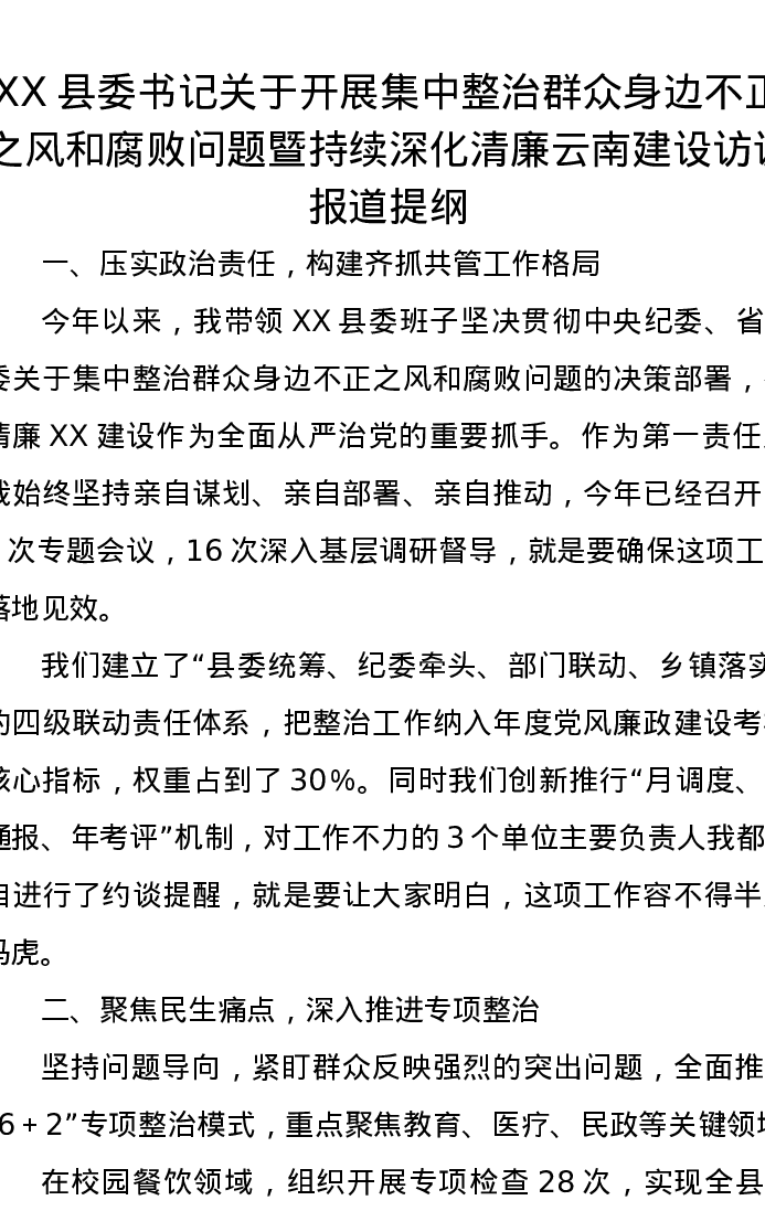 XX县委书记关于开展集中整治群众身边不正之风和腐败问题暨持续深化清廉云南建设访谈报道提纲