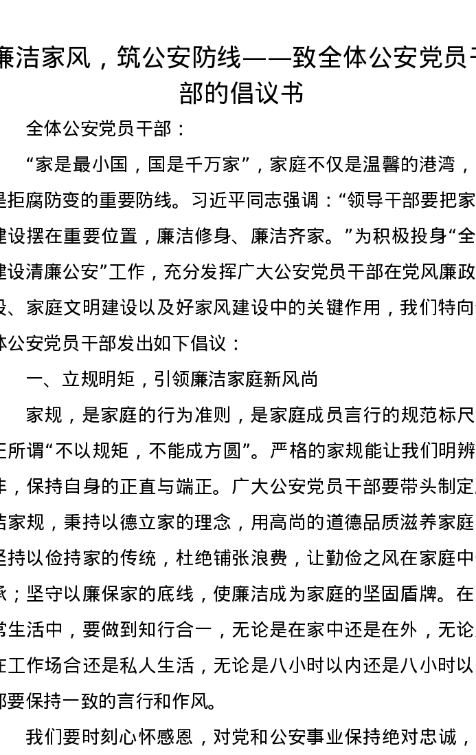 廉洁家风,筑公安防线——致全体公安党员干部的倡议书