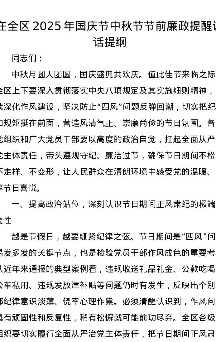 在全区2025年国庆节中秋节节前廉政提醒谈话提纲