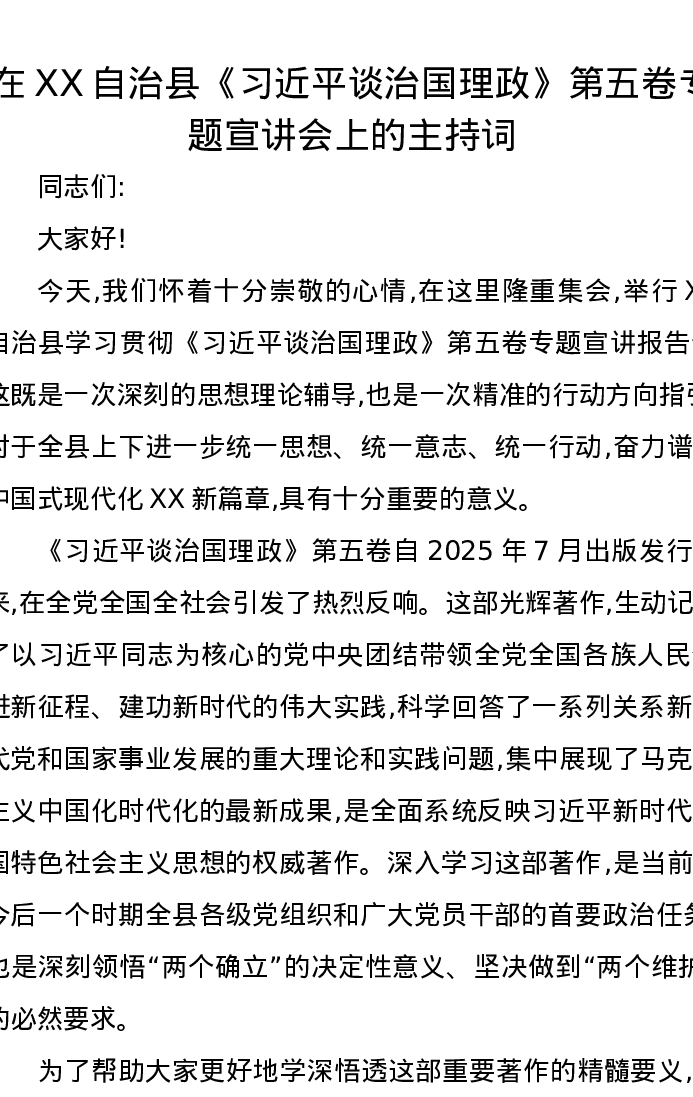 在XX自治县《习近平谈治国理政》第五卷专题宣讲会上的主持词