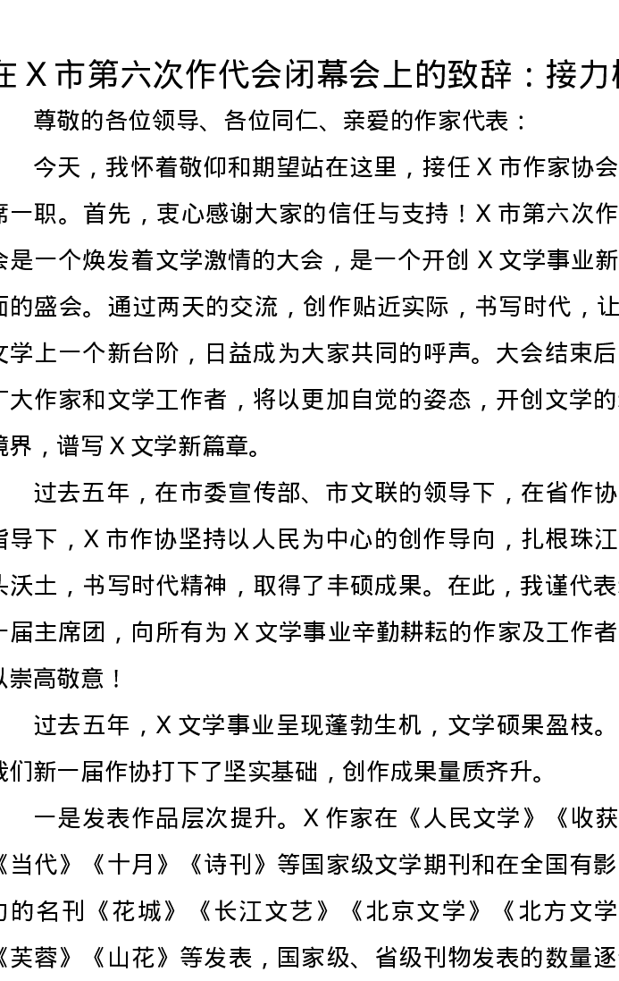在X市第六次作代会闭幕会上的致辞:接力棒