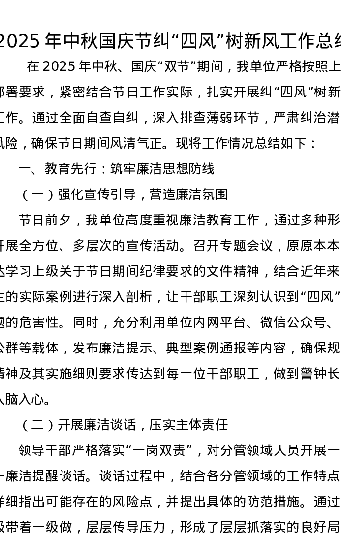 2025年中秋国庆节纠“四风”树新风工作总结