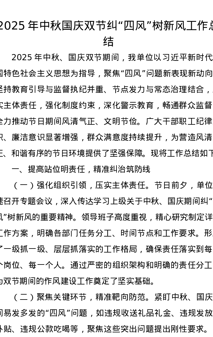2025年中秋国庆双节纠“四风”树新风工作总结