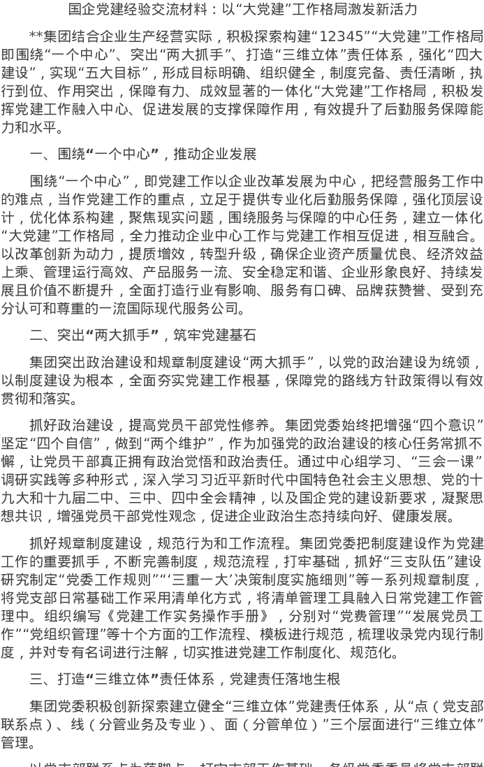 20220527国企党建经验交流材料:以“大党建”工作格局激发新活力