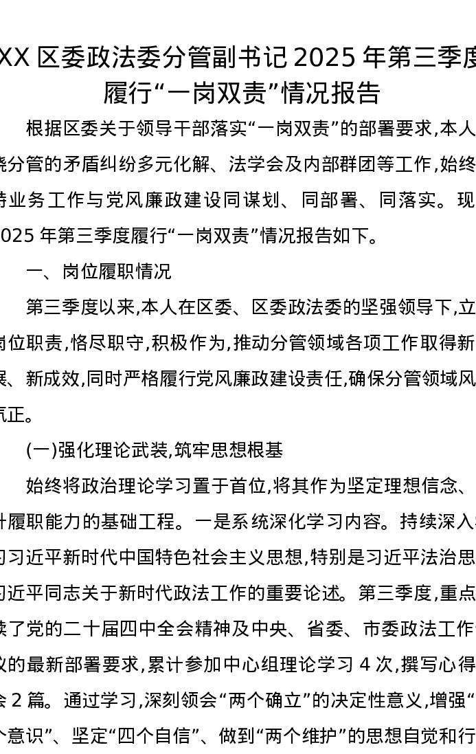 XX区委政法委分管副书记2025年第三季度履行“一岗双责”情况报告