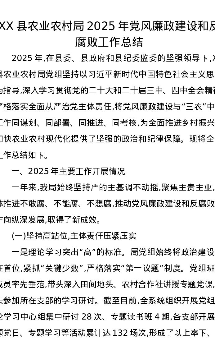 XX县农业农村局2025年党风廉政建设和反腐败工作总结
