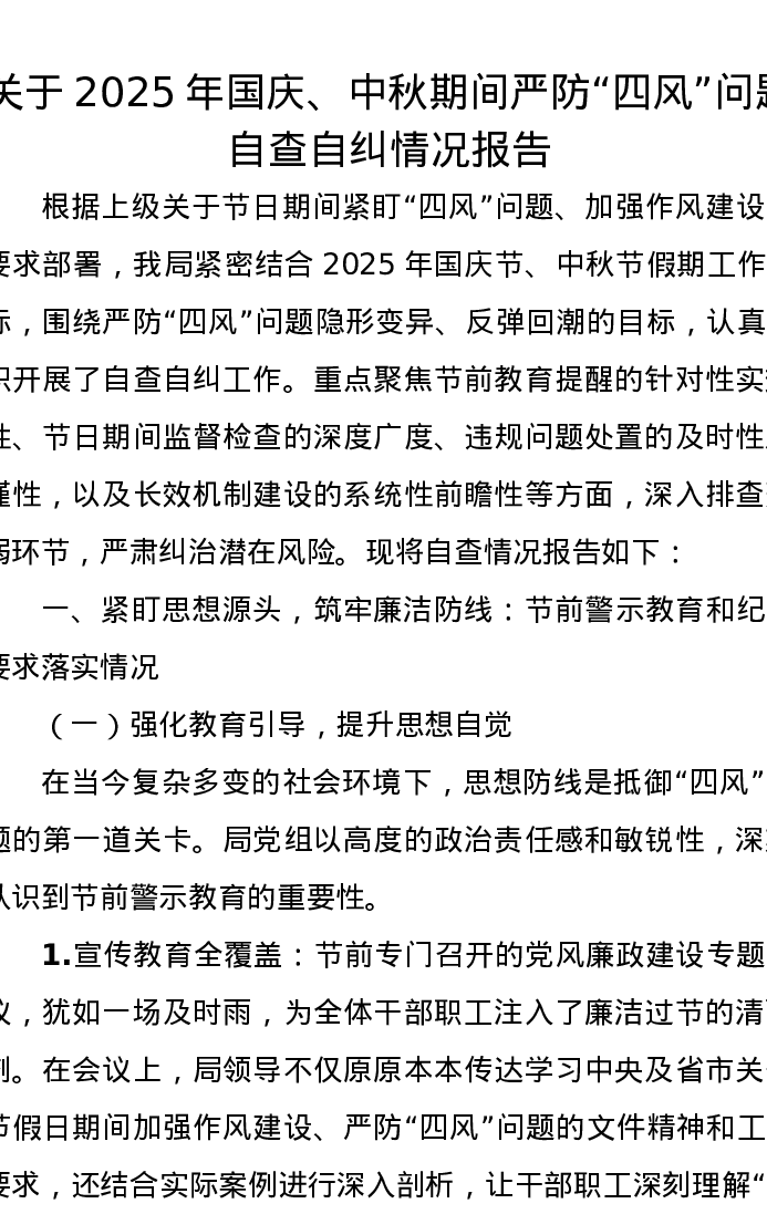 关于2025年国庆、中秋期间严防“四风”问题自查自纠情况报告