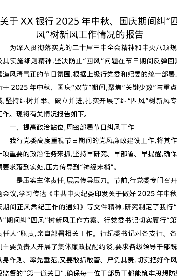 关于XX银行2025年中秋、国庆期间纠“四风”树新风工作情况的报告