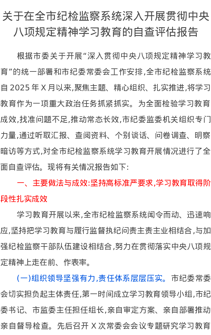 关于在全市纪检监察系统深入开展贯彻中央八项规定精神学习教育的自查评估报告